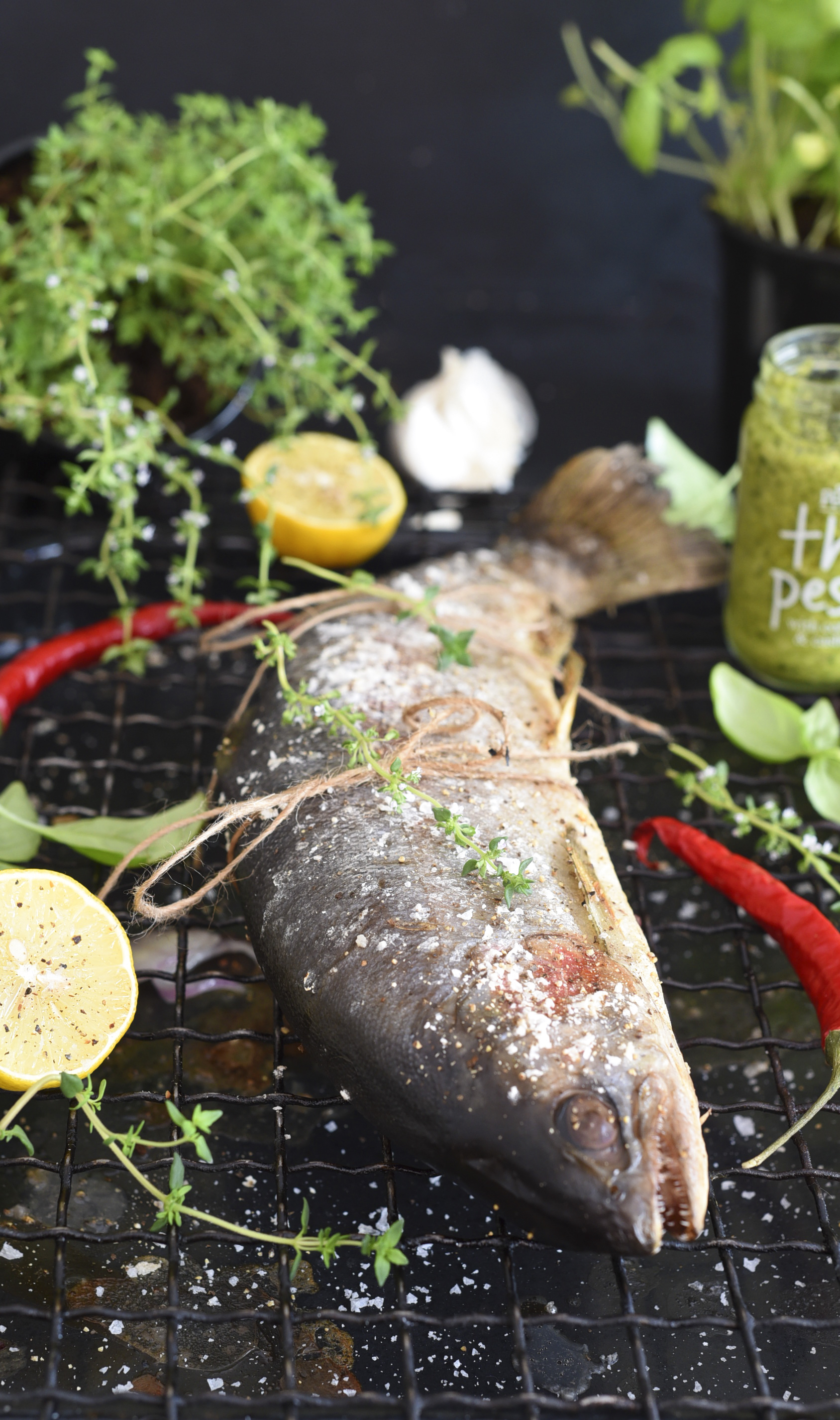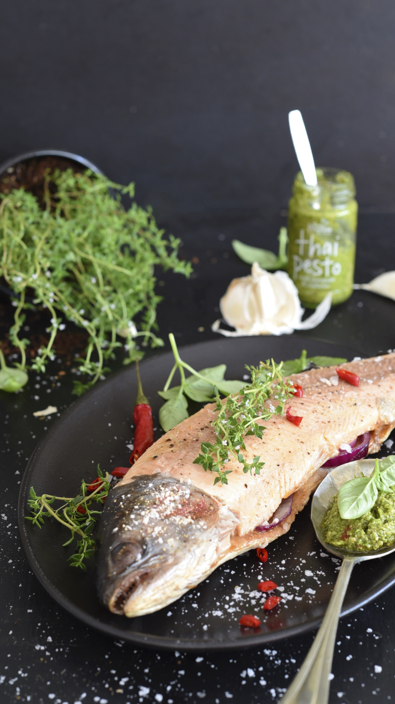 Use paper toweling and pat dry the trout inside and outside. Use the whole jar of pesto and spread lavishly on the inside of the trout. Pack a layer on red onion slices and fresh coriander inside the trout. Use string the secure tie around the fish to keep the filling inside while grilling.