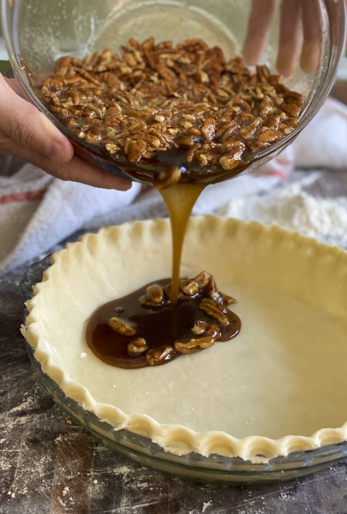 Beat the eggs in a mixing bowl, using a whisk. Very slowly add the sugar mixture to the eggs, while you whisk vigorously to prevent the eggs from cooking. This is called tempering. Add the pecan nuts and mix. Pour this mixture into the pie crust. Bake for 40 – 45 minutes. % minutes before the end, I brushed my pie crust with a little butter for added colour.