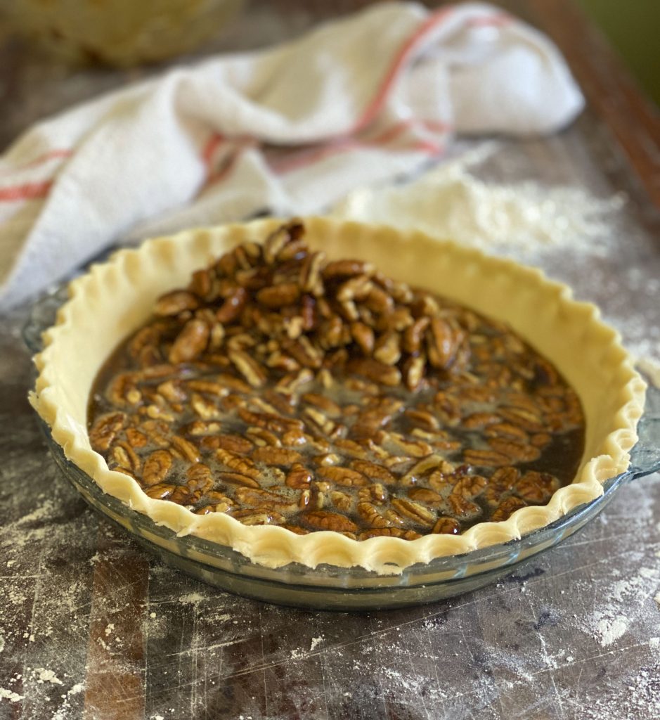 When we talk about Pecans, the obvious recipe that comes to mind is Pecan Pie or baklava. It’s impossible to go wrong with pecan pie. Especially one that is really loaded with nuts, hints of vanilla and dark brown sugar. The crust is essential, but it must be thin and just enough to hold the goodness together. It is not puff pastry that must shine in all its puffed-up glory. It must be a thin, buttery shortcrust pastry and the recipe I am using comes from the book, DEEG, written by my good friend, Theresa De Vries. Ok, so let me tell you how to make this delicious pecan pie.