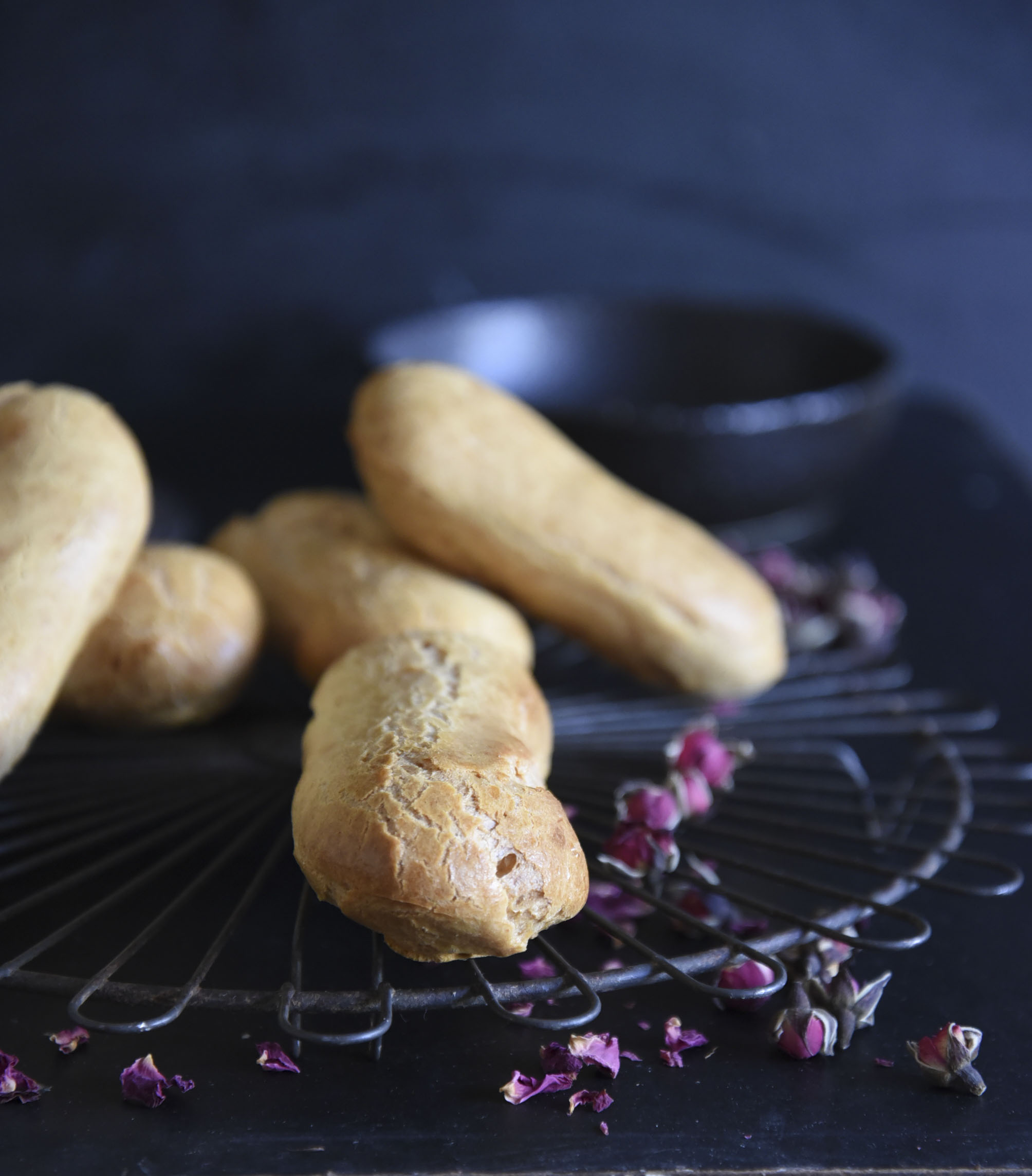 I made the Rose and Pistachio Eclairs over the weekend, but was not happy with the form, so tried them again yesterday. I am still not happy with the form, I think my piping nozzle is too wide. Anyway, they are too good not to share.