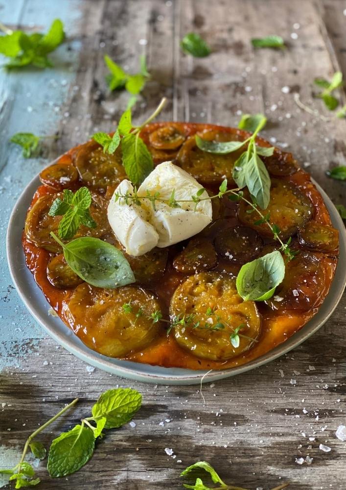 Preheat oven to 200 C. Spray a 23-25 cm tart dish with Spray n Cook. Drizzle the balsamic vinegar in the bottom of the pan and top with the sugar. Cut all the tomatoes in 1 cm slices and lay them in the bottom of the dish. Season with salt and pepper and fresh thyme. Cut the puff pastry in a circle big enough to fit the pan. Lay the pastry over the tomatoes and tuck it in on the sides. Bake for 20-25 minutes or until the pastry has a light brown color. Invert your serving plate over the tart dish and turn the tarte tatin out. Tear the mozzarella and place on the taste with the fresh herbs of your choice and a drizzle of olive oil.