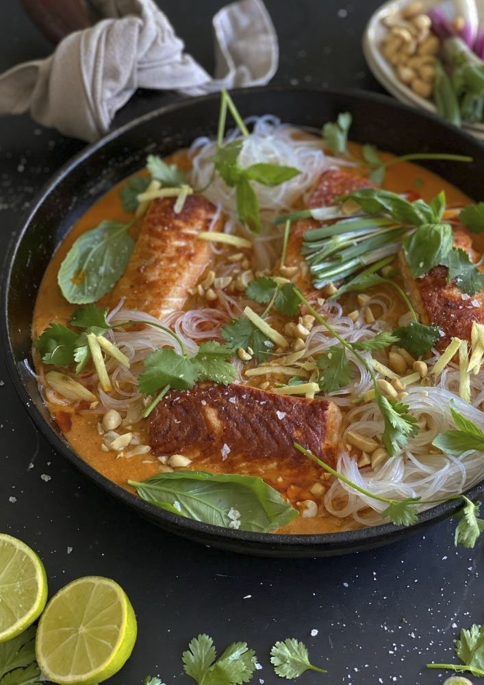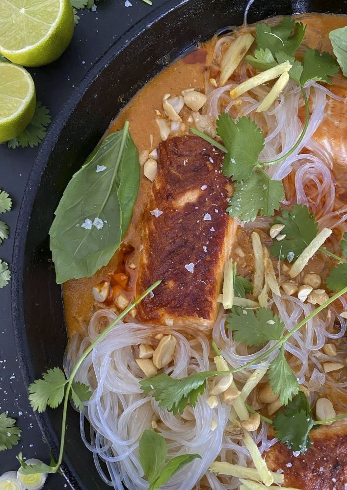 Remove the salmon from the skillet and pace the skillet on the stove top. Add the oil, garlic, ginger and brown sugar and stir to caramelize the garlic. Keep your eye on it though, it burns very quickly. Add the coconut cream and water and all the other ingredients. Cook the sauce for 2-3 minutes and add the salmon back to the skillet. Cook for another 5-10 minutes until the sauce is luscious and thick. Add the lime zest and juice and adjust seasoning. Lastly add the noodles or pasta and fresh herbs, chopped peanuts and serve.