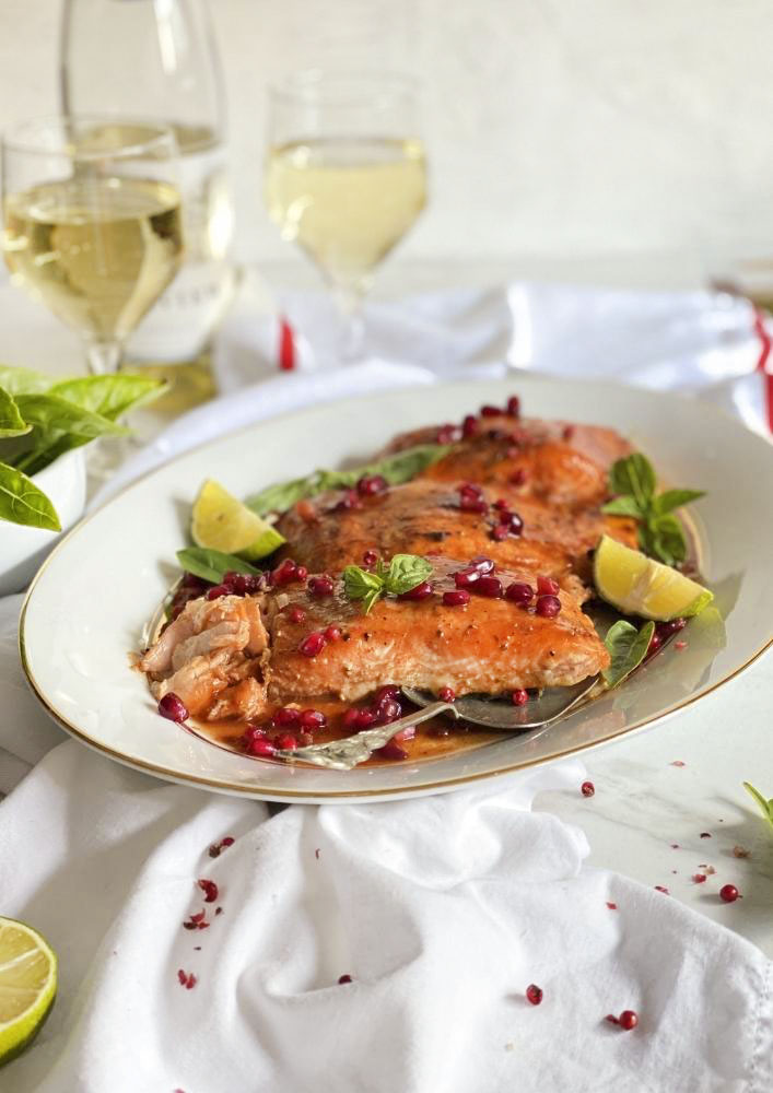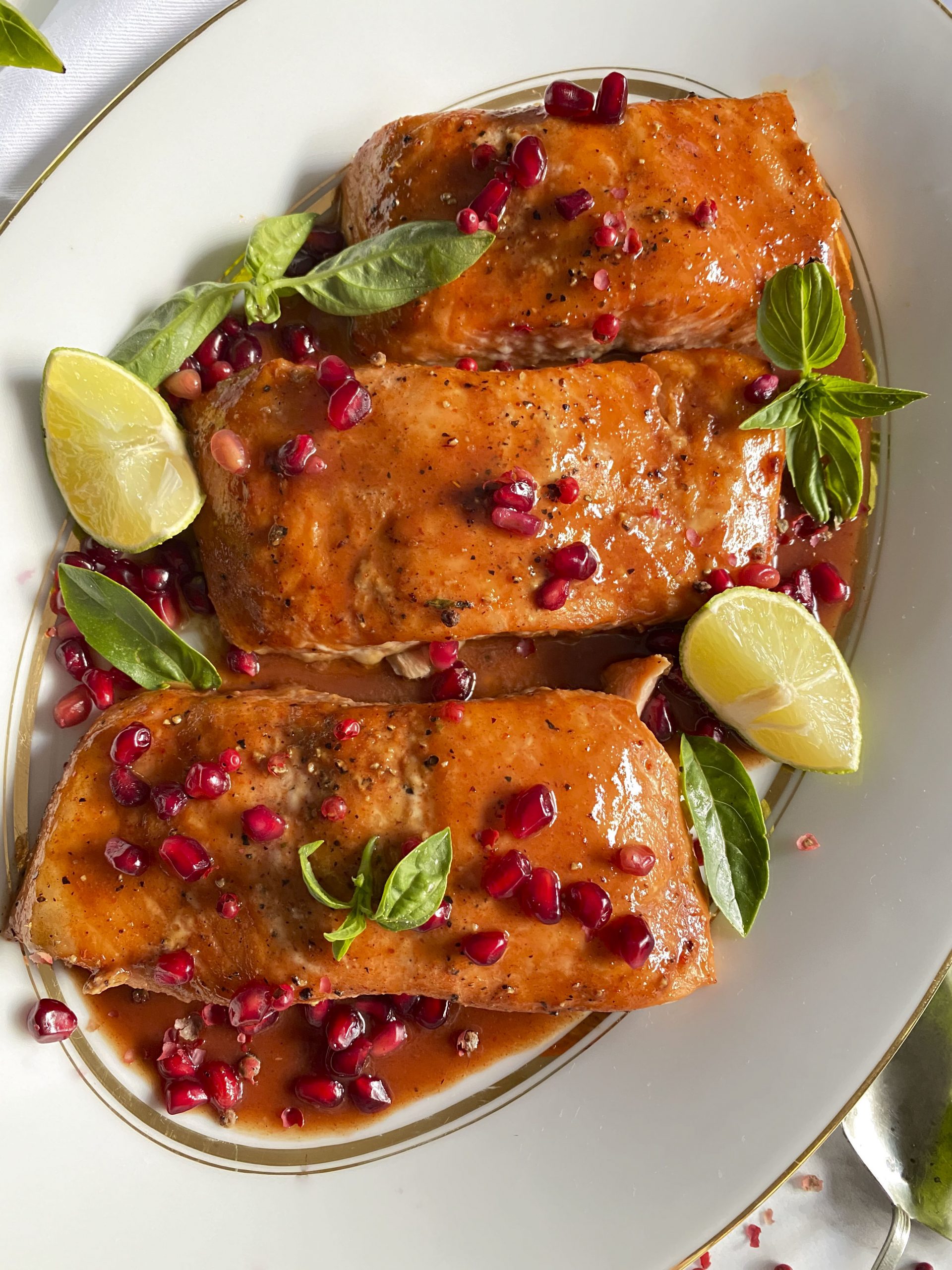 When the salmon comes from the oven, place on a beautiful serving platter adn pour sauce over salmon. Decorate with herbs and pomegranate pips.