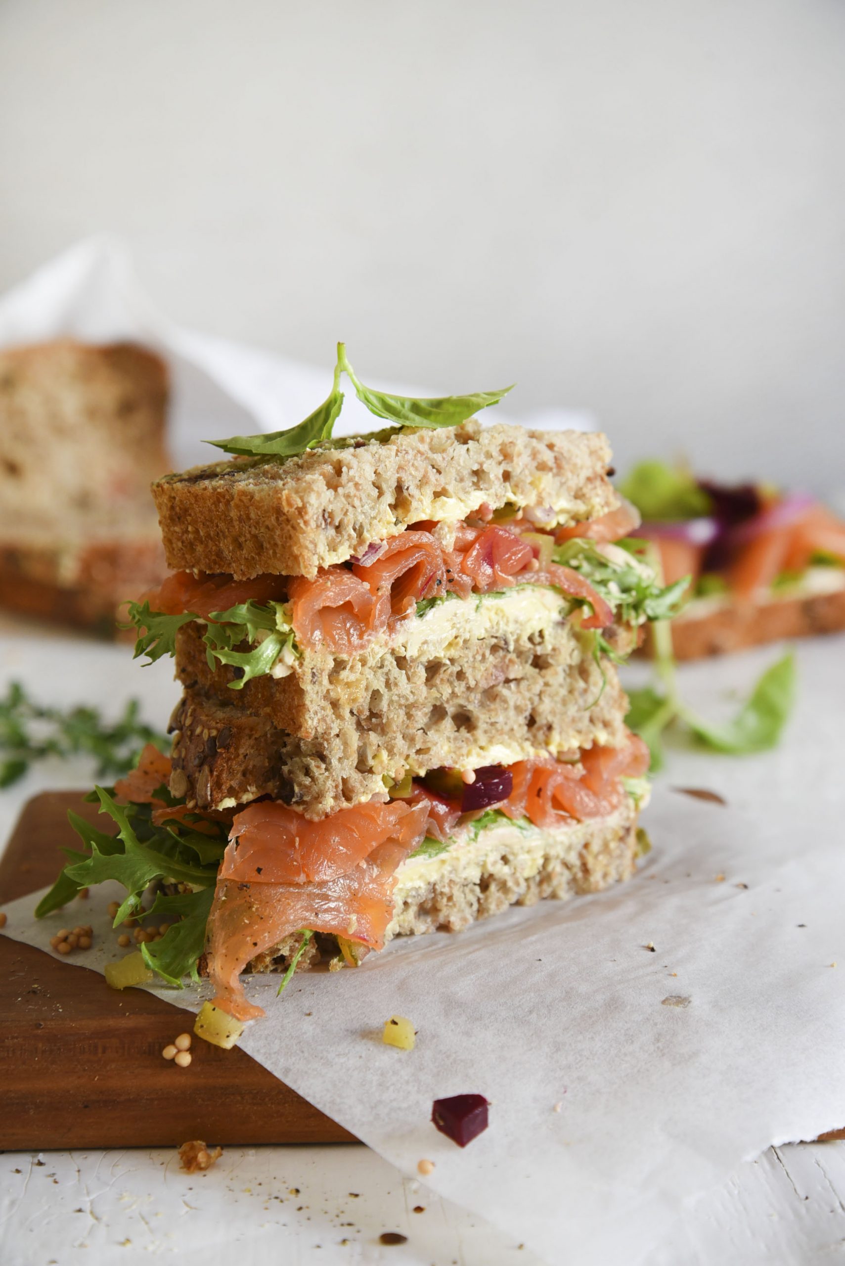 the thin slices of beetroot and gherkin cubes on the salmon. Grind some black pepper on top and place the other slice on bread on top.