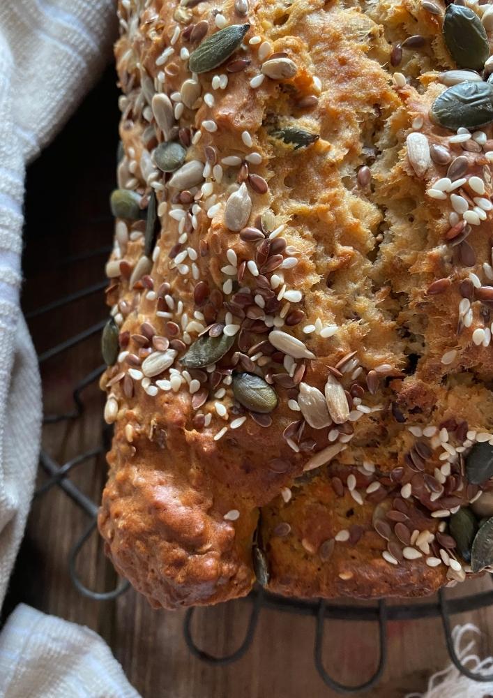 Add the wet ingredients to the dry ingredients and mix properly. Spoon the mixture into the two bread tins. Sprinkle the 1/2 cup seeds over the two loaves and bake for 45 min or until a skewer comes out clean.