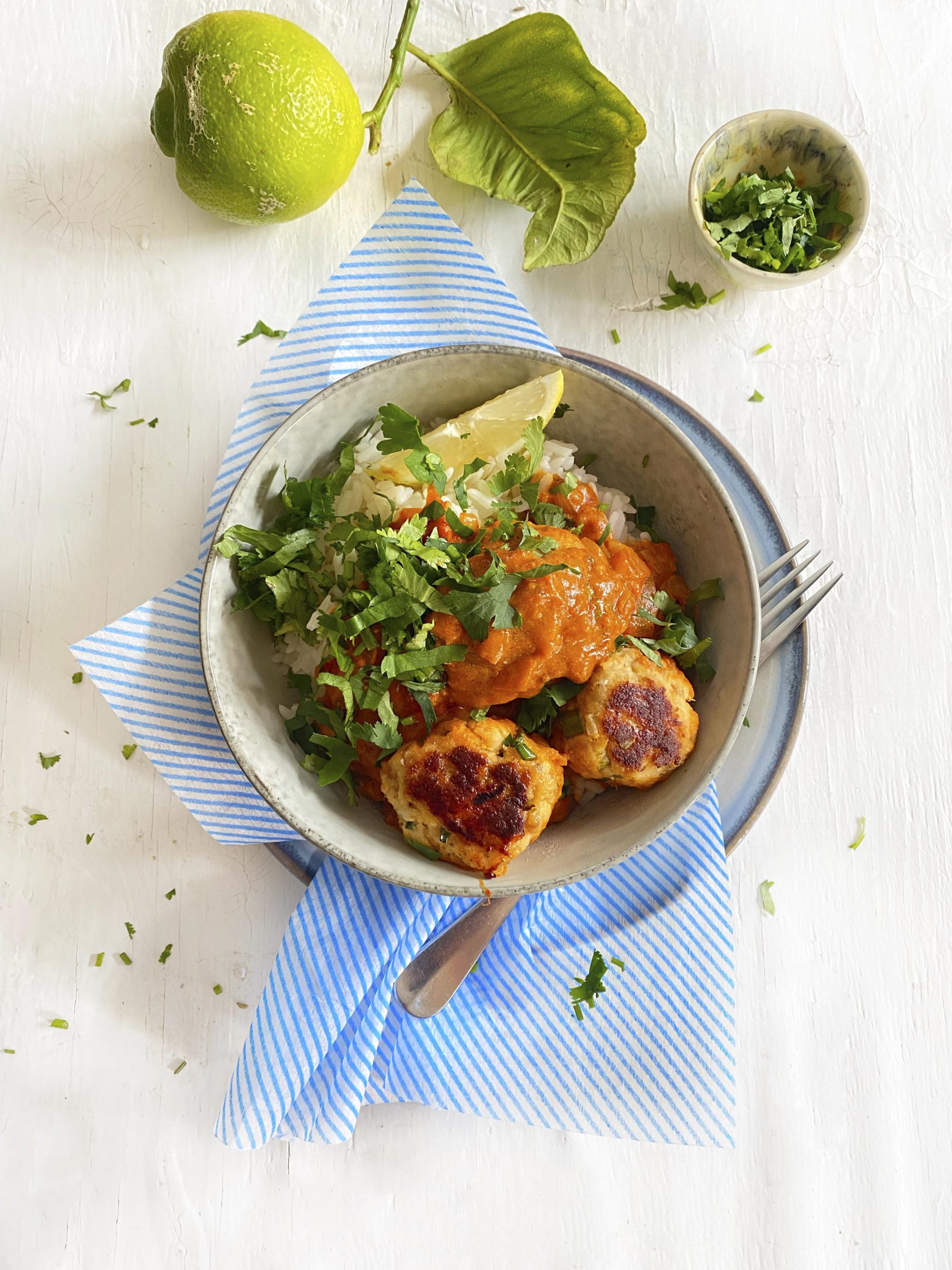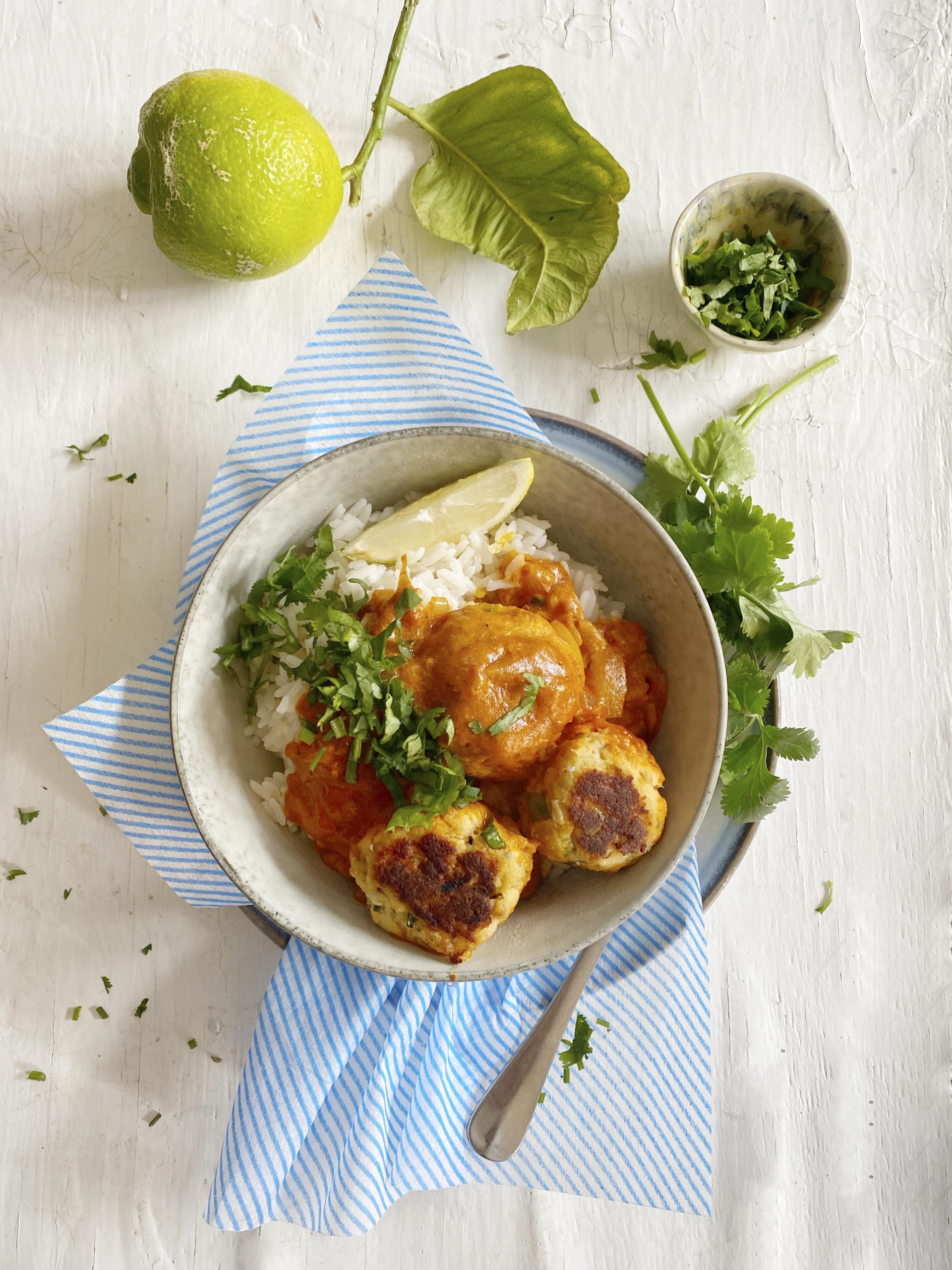 In the same pan, sauté the onions until translucent. Add the garlic and ginger and sauté for 2 more minutes. Now add the tomato sauce and fish masala and bring to the boil. Add the coconut cream. Turn the heat to low and let the sauce simmer until it has thickened slightly. Add the frikkadels and simmer for another 10 minutes. Taste and season with salt and pepper. Add the chopped coriander just before serving.