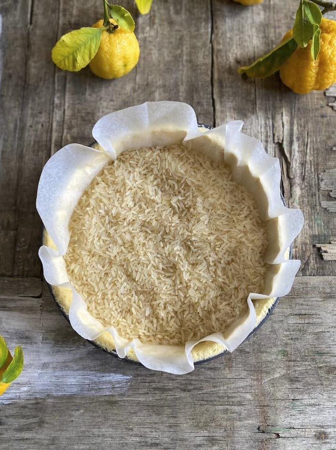 Prepare a 23 cm deep tart dish by spraying it with non-stick spray. Mix all the dry ingredients. Add the ice cold butter cubes. Use your fingertips en rub the spread into the flour until it resembles fine bread crumbs. Mix the egg yolk with the water and lemon juice. Add to the dry ingredients and mix until the pastry comes together in a ball. Rest in the fridge for 30 minutes. Spray the baking dish with non-stick spray. Roll out the pastry on a floured surface to about 3-4 mm thick. Line the base with baking paper and fill with rice or baking beans. Bake for about 10 min. Remove the rice and bake, prick the pastry with a fork and bake the crust for another 5 minutes. Cool the crust.