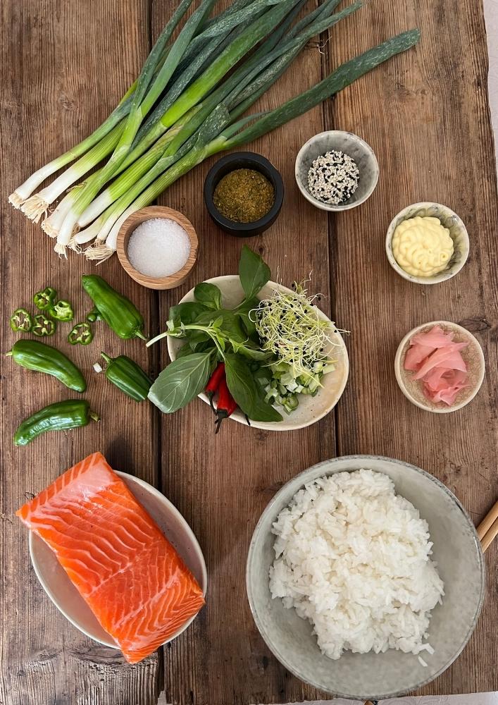 Divide the rice into two bowls and add the flaked salmon to both bowls. Add all the kewpie mayo, chopped chillies, chopped spring onions, basil and sesame oil to the bowls and lightly mix with a fork. Top with all the other ingredients and serve.