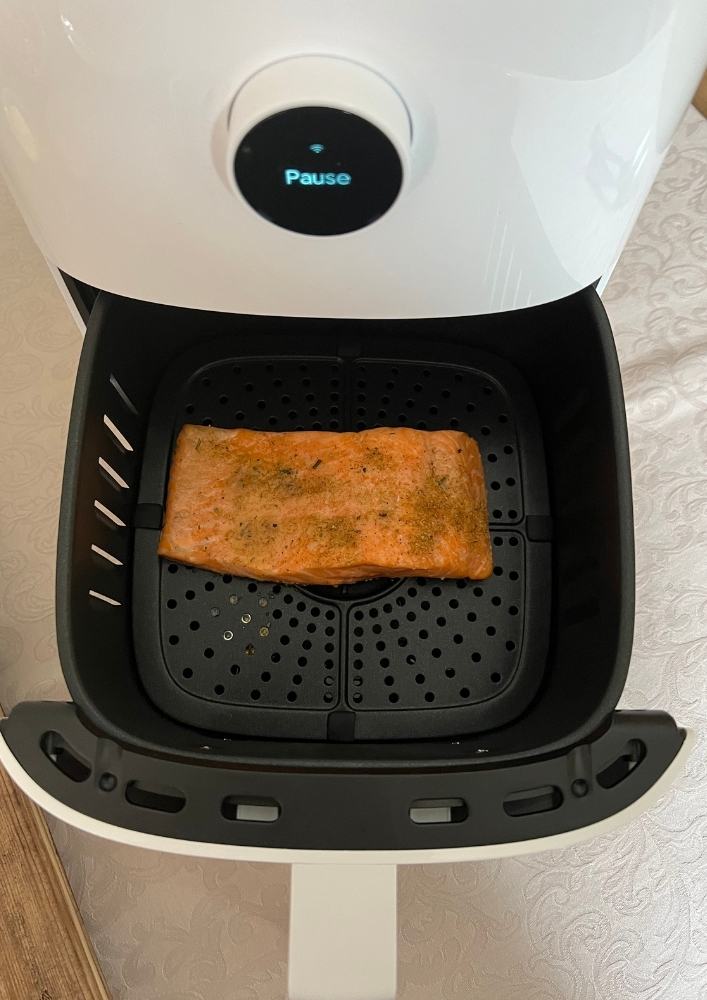 The air fryer is big enough for 3 pieces of salmon, but this recipe serves 2. Simply season the salmon with salt and pepper or any other spice you prefer and place in the air fryer , skin down. Drizle some olive oil on the top. Choose the FISH option on your air and cook the fish for 10 minutes. If you eat the fish as a main portion, 8 minutes will do.