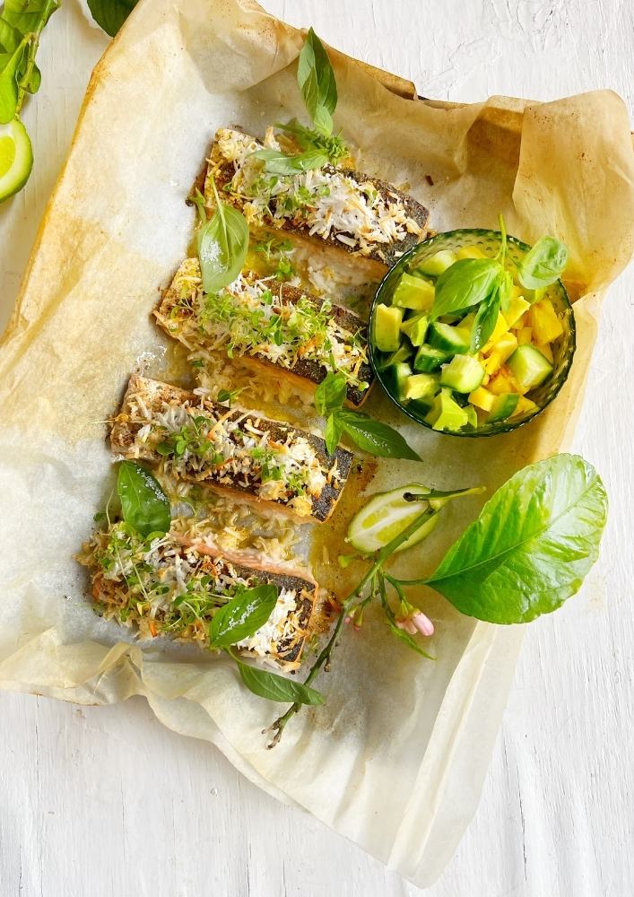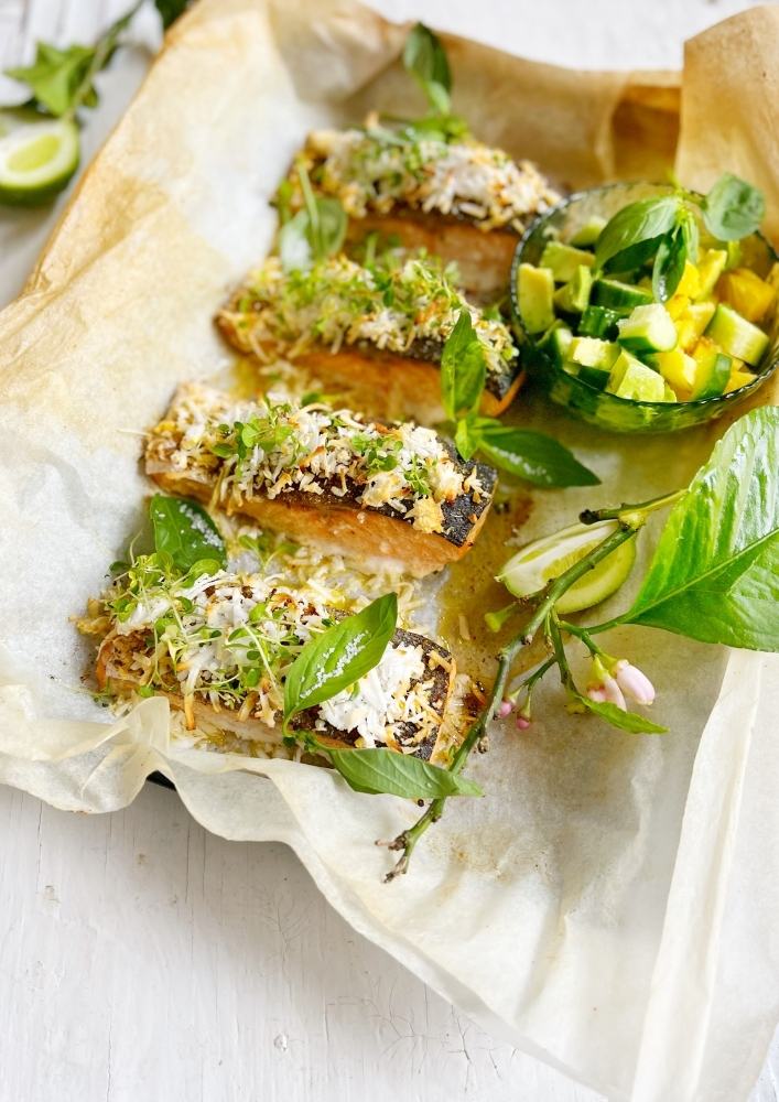 Coconut Salmon with Coconut-lime Dressing is just perfect for the hot summer days and lazy holidays that we are awaiting with much excitement. The dressing you can make in advance, the salmon you can prep in advance, so there is very little to do other than pouring yourself a drink and relax.